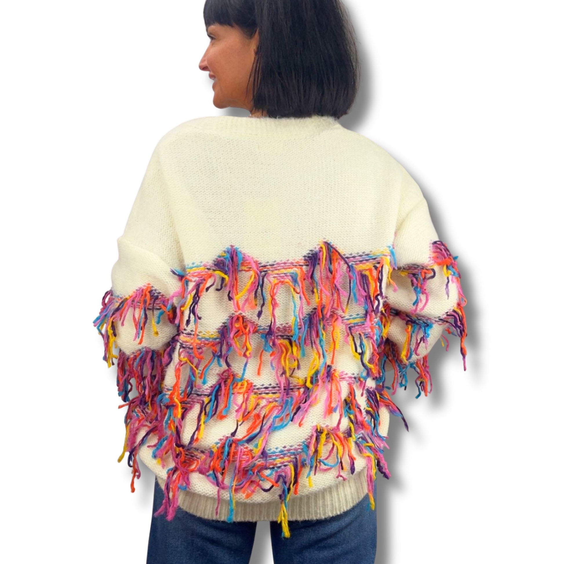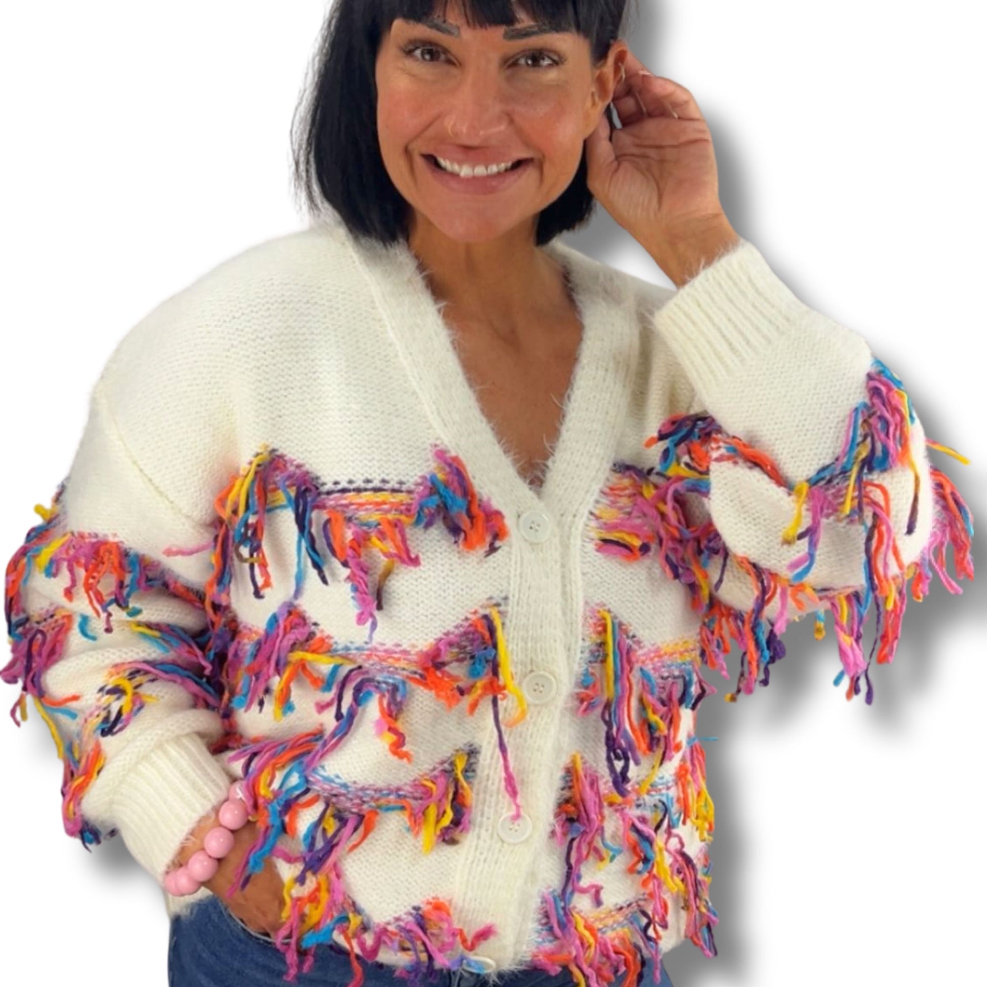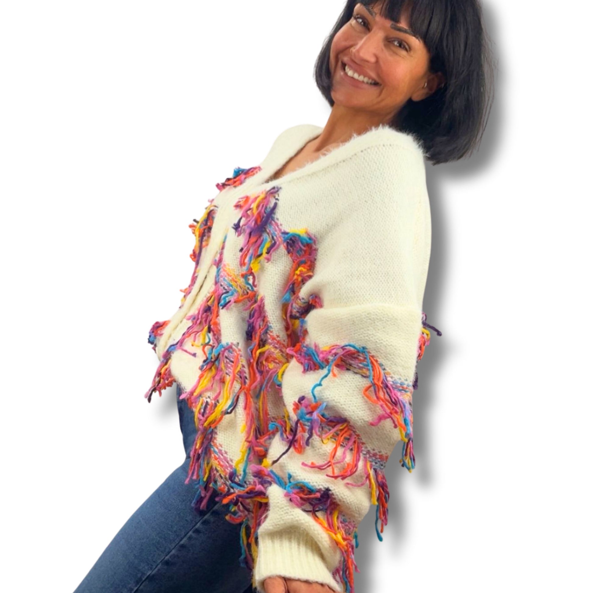 Die bunten Fransen tanzen fröhlich über den weichen Strick und machen jedes Outfit sofort lebendig. Ob lässig zur Jeans oder als fröhlicher Farbakzent über einem schlichten Look – er schenkt dir Wärme, Leichtigkeit und ein Lächeln 😊