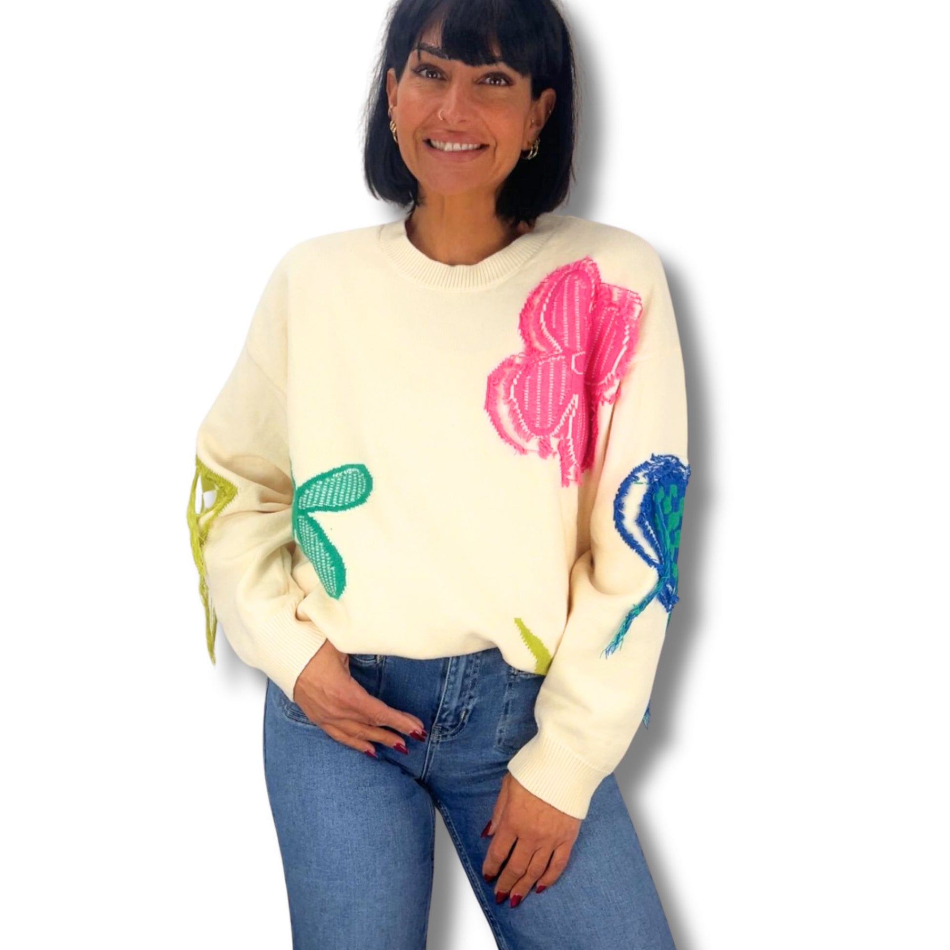 Dieser besondere Pullover ist ein echter Hingucker! Die liebevoll gestalteten, farbenfrohen Applikationen machen ihn zu einem einzigartigen Statement-Piece – perfekt für alle, die Mode mit Persönlichkeit lieben.