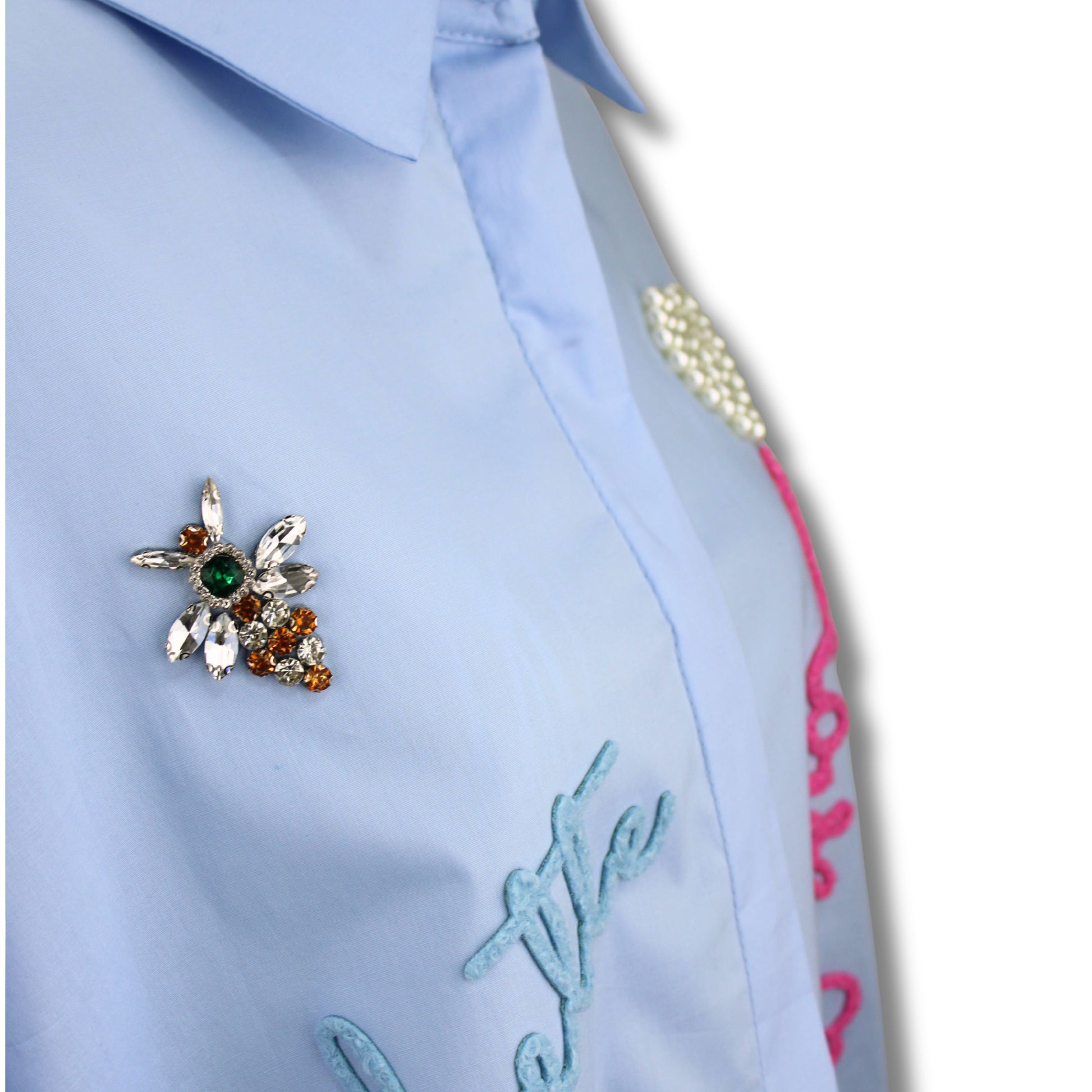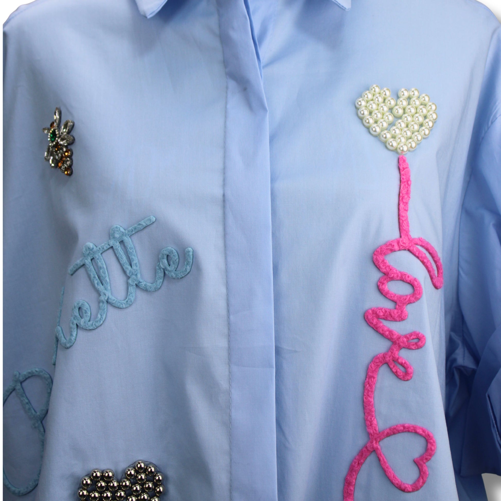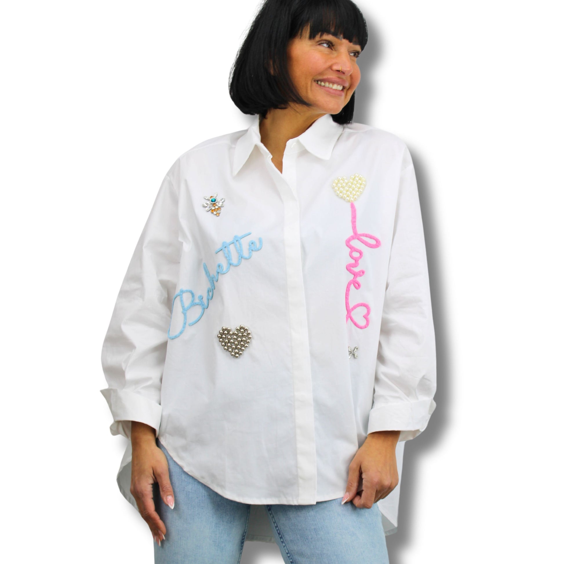 Diese besondere weiße Bluse begeistert mit ihrem zeitlosen Schnitt und den liebevollen, verspielten Applikationen. Zarte Herz-Details, feine Stickereien und kleine Akzente machen sie zu einem echten Lieblingsstück – feminin, modern und voller Charme.